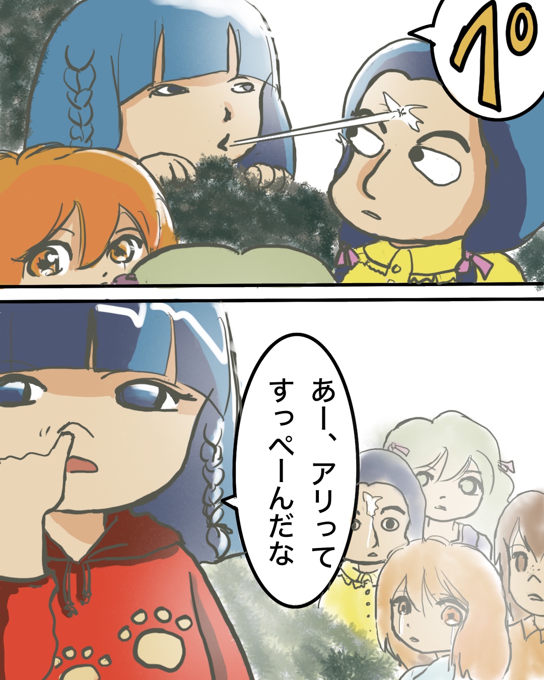 かりんちゃんは難を逃れたけど、青い髪の子がアリを…しかし彼女の中では自慢の話になるみたいで、まぁ良かった?