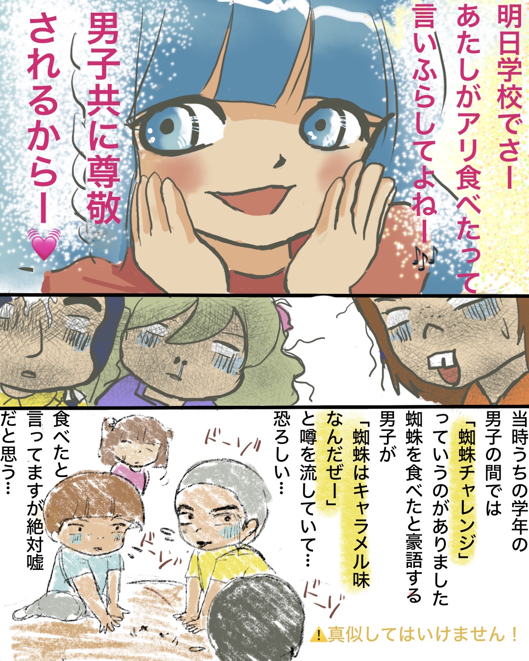 ちなみにアリは蟻酸というのが入っていて酸っぱいらしいです。(実際に食べた青い髪の子が言っていました)
