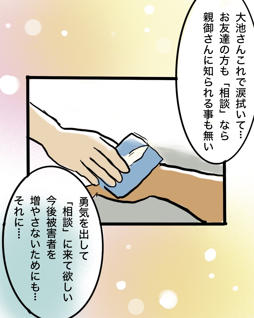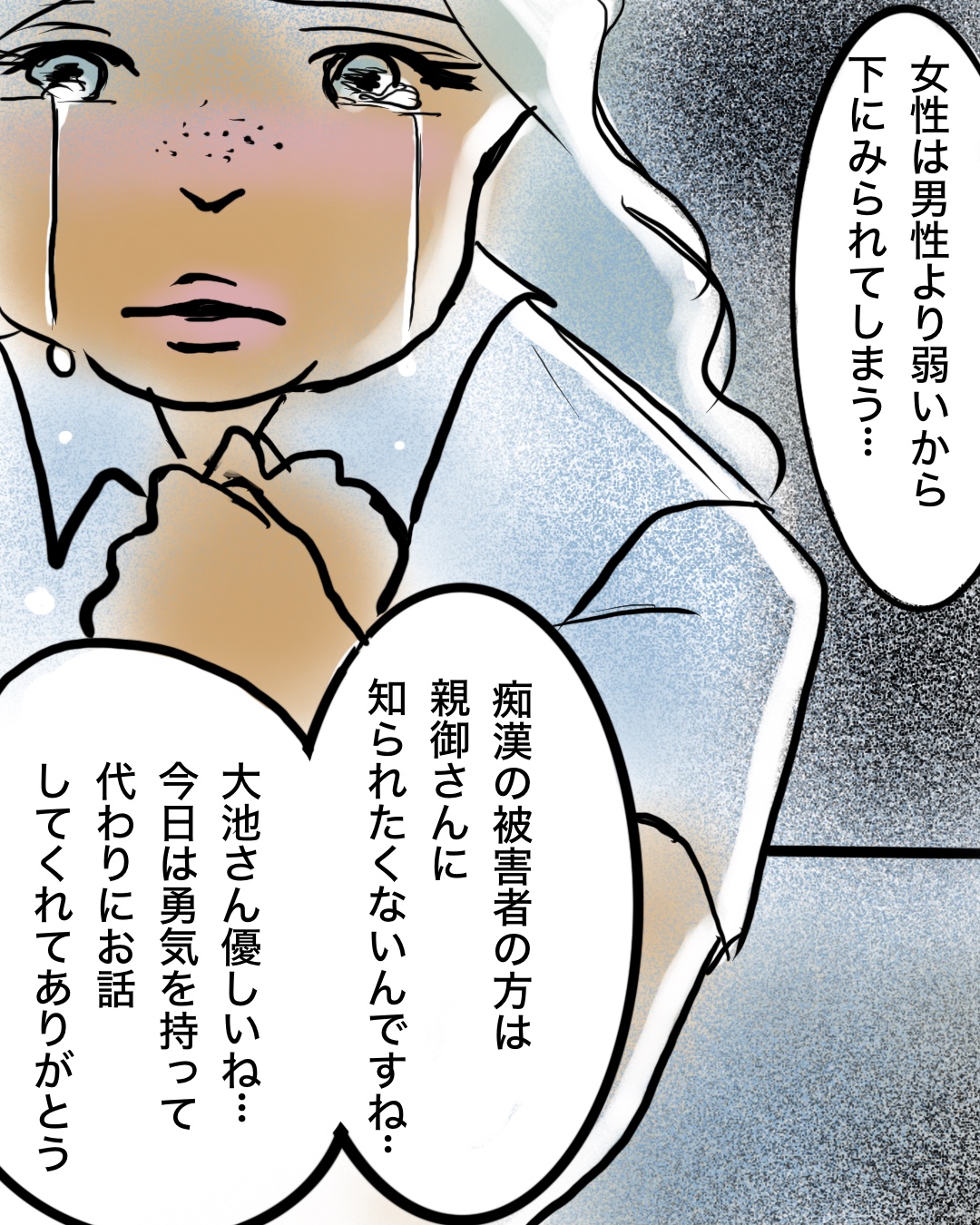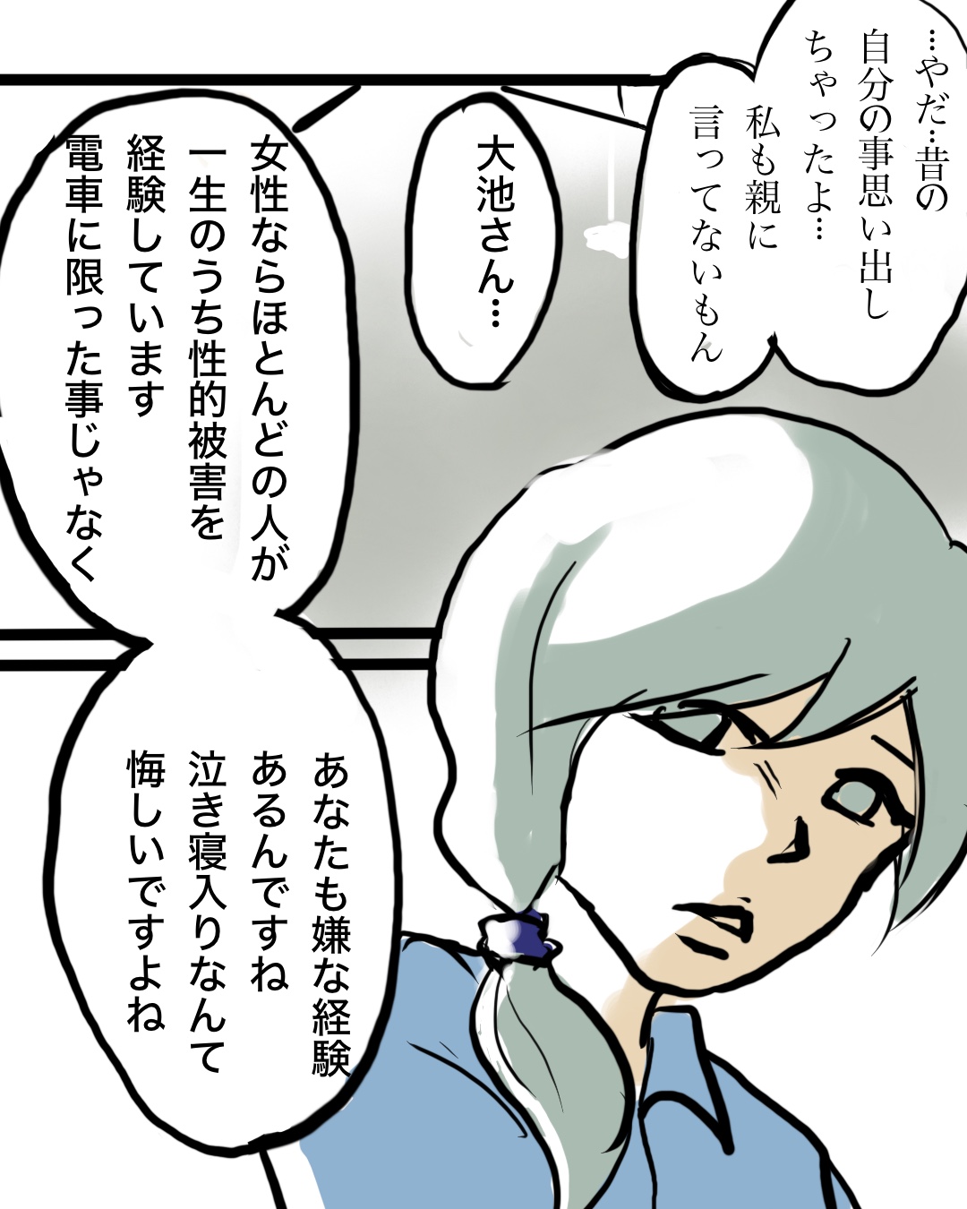 45話 痴漢なんて捕まえるもんじゃない そう思った。 2025.11.19 痴漢なんて捕まえるもんじゃない そう思った。 恋愛, 満員電車, 痴漢被害, 高校生 45話 痴漢なんて捕まえるもんじゃない そう思った。 ビー子はなんとか犯人を捕まえたくて、説明しますが… 広告 ビー子、警察に話は聞いてもらえた…本当はサリちゃんが直接話した方がいいのだろうけど。ビー子も過去に嫌な目に遭っています。そしてサリちゃんの心の傷も深そうです。 今回の警官の話はあくまでこの漫画の駅近辺、都会の話です。私は田舎に住んでいた時は周りも痴漢に遭った事ある人ほぼいなくて、都会に来てから色々な人に話を聞くと、女性はなにかしらほぼ被害あります。電車も満員電車だし、人口も多いのもあるかもしれませんが…。 46話に続きます。 15 同じカテゴリの記事 48話 痴漢なんて捕まえるもんじゃない そう思った。 47話 痴漢なんて捕まえるもんじゃない そう思った。 46話 痴漢なんて捕まえるもんじゃない そう思った。 45話 痴漢なんて捕まえるもんじゃない そう思った。 44話 痴漢なんて捕まえるもんじゃない そう思った。 43話 痴漢なんて捕まえるもんじゃない そう思った。 42話 痴漢なんて捕まえるもんじゃない そう思った。 41話 痴漢なんて捕まえるもんじゃない そう思った。 40話 痴漢なんて捕まえるもんじゃない そう思った。 39話 痴漢なんて捕まえるもんじゃない そう思った。 38話 痴漢なんて捕まえるもんじゃない そう思った。 37話 痴漢なんて捕まえるもんじゃない そう思った。 36話 痴漢なんて捕まえるもんじゃない そう思った。 35話 痴漢なんて捕まえるもんじゃない そう思った。 34話 痴漢なんて捕まえるもんじゃない そう思った。 33話 痴漢なんて捕まえるもんじゃない そう思った。 32話 痴漢なんて捕まえるもんじゃない そう思った。 31話 痴漢なんて捕まえるもんじゃない そう思った。 30話 痴漢なんて捕まえるもんじゃない そう思った。 29話 痴漢なんて捕まえるもんじゃない そう思った。 28話 痴漢なんて捕まえるもんじゃない そう思った。 27話 痴漢なんて捕まえるもんじゃない そう思った。 26話 痴漢なんて捕まえるもんじゃない そう思った。 25話 痴漢なんて捕まえるもんじゃない そう思った。 24話 痴漢なんて捕まえるもんじゃない そう思った。 23話 痴漢なんて捕まえるもんじゃない そう思った。 22話 痴漢なんて捕まえるもんじゃない そう思った。 21話 痴漢なんて捕まえるもんじゃない そう思った。 20話 痴漢なんて捕まえるもんじゃない そう思った。 19話 痴漢なんて捕まえるもんじゃない そう思った。 18話 痴漢なんて捕まえるもんじゃない そう思った。 17話 痴漢なんて捕まえるもんじゃない そう思った。 16話 痴漢なんて捕まえるもんじゃない そう思った。 15話 痴漢なんて捕まえるもんじゃない そう思った。 14話 痴漢なんて捕まえるもんじゃない そう思った。 13話 痴漢なんて捕まえるもんじゃない そう思った。 12話 痴漢なんて捕まえるもんじゃない そう思った。 11話 痴漢なんて捕まえるもんじゃない そう思った。 10話 痴漢なんて捕まえるもんじゃない そう思った。 9話 痴漢なんて捕まえるもんじゃない そう思った。 8話 痴漢なんて捕まえるもんじゃない そう思った。 7話 痴漢なんて捕まえるもんじゃない そう思った。 6話 痴漢なんて捕まえるもんじゃない そう思った。 5話 痴漢なんて捕まえるもんじゃない そう思った。 4話 痴漢なんて捕まえるもんじゃない そう思った。 3話 痴漢なんて捕まえるもんじゃない そう思った。 2話 痴漢なんて捕まえるもんじゃない そう思った。 1話 痴漢なんて捕まえるもんじゃない そう思った。 前の記事 55話 転校生ともだちがいなくなった(最終話) 2025.11.17 次の記事 46話 イタリア旅行でハズレ添乗員に当選しました 2025.11.22 アプリなら通知ですぐ読める! NAPBIZブログ