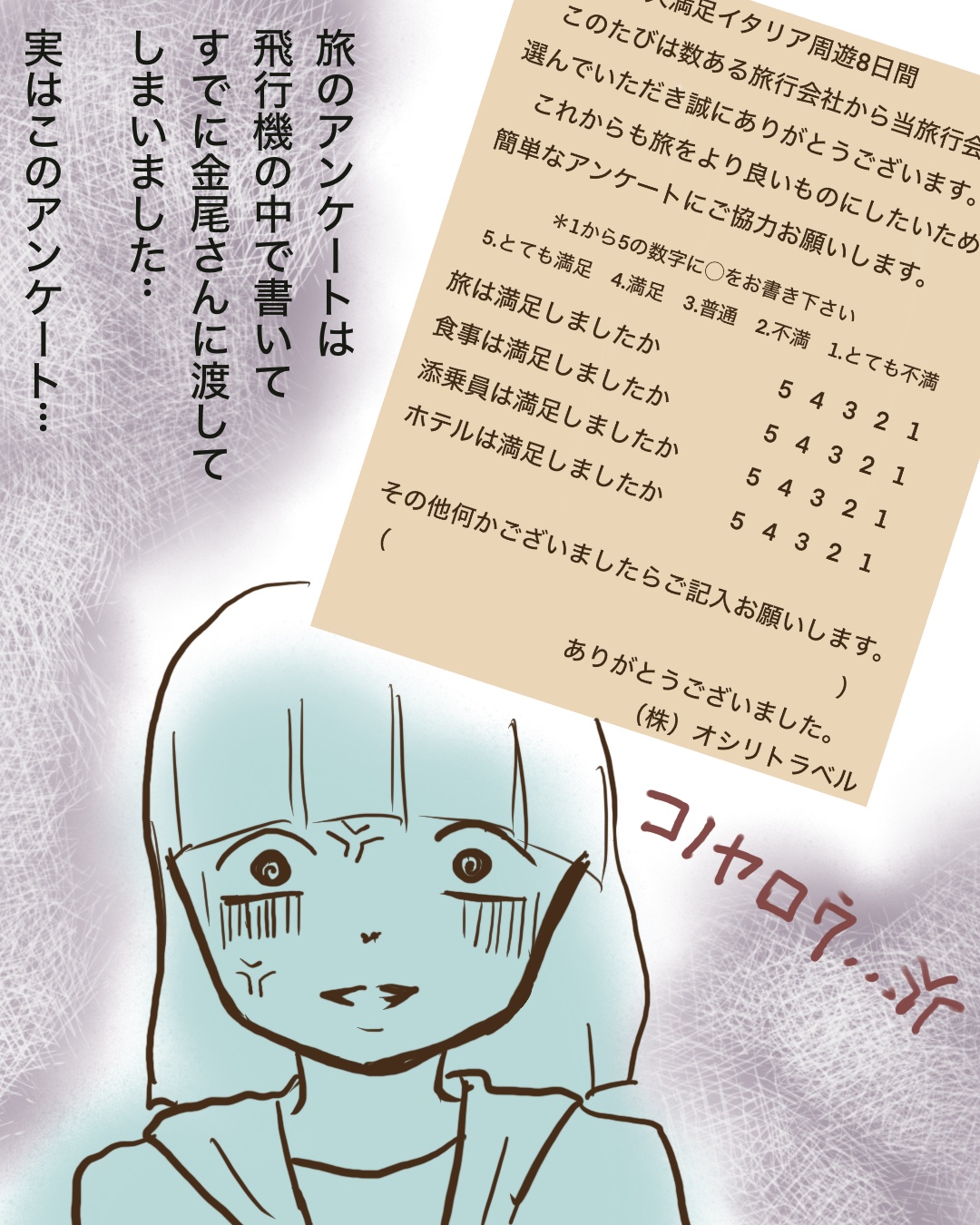 47話 イタリア旅行でハズレ添乗員に当選しました 2025.11.30 イタリア旅行でハズレ添乗員に当選しました【完結済】 やばい添乗員, イタリア旅行, 旅行トラブル, 海外旅行 47話 イタリア旅行でハズレ添乗員に当選しました 本当に最終日…ついに日本に戻ったよ!旅のアンケートも提出しなきゃね🎵 広告 広告 旅の最終日に酷い発言をする金尾添乗員…アンケートも無事回収したし、もう何を言っても許されると思ったのか? この発言は、美魔女さんと朝子さんも聞いて金尾さんに否定の発言してくれたんですが、聞く耳持たずでした。次回最終話です。 48話に続きます。 11 同じカテゴリの記事 48話 イタリア旅行でハズレ添乗員に当選しました【最終話】 47話 イタリア旅行でハズレ添乗員に当選しました 46話 イタリア旅行でハズレ添乗員に当選しました 45話 イタリア旅行でハズレ添乗員に当選しました 44話 イタリア旅行でハズレ添乗員に当選しました 43話 イタリア旅行でハズレ添乗員に当選しました 42話 イタリア旅行でハズレ添乗員に当選しました 41話 イタリア旅行でハズレ添乗員に当選しました 40話 イタリア旅行でハズレ添乗員に当選しました 39話 イタリア旅行でハズレ添乗員に当選しました 38話 イタリア旅行でハズレ添乗員に当選しました 37話 イタリア旅行でハズレ添乗員に当選しました 36話 イタリア旅行でハズレ添乗員に当選しました 35話 イタリア旅行でハズレ添乗員に当選しました 34話 イタリア旅行でハズレ添乗員に当選しました 33話 イタリア旅行でハズレ添乗員に当選しました 32話 イタリア旅行でハズレ添乗員に当選しました 31話 イタリア旅行でハズレ添乗員に当選しました 30話 イタリア旅行でハズレ添乗員に当選しました 29話 イタリア旅行でハズレ添乗員に当選しました 28話 イタリア旅行でハズレ添乗員に当選しました 27話 イタリア旅行でハズレ添乗員に当選しました 26話 イタリア旅行でハズレ添乗員に当選しました 25話 イタリア旅行でハズレ添乗員に当選しました 24話 イタリア旅行でハズレ添乗員に当選しました 23話 イタリア旅行でハズレ添乗員に当選しました 22話 イタリア旅行でハズレ添乗員に当選しました 21話 イタリア旅行でハズレ添乗員に当選しました 20話 イタリア旅行でハズレ添乗員に当選しました 19話 イタリア旅行でハズレ添乗員に当選しました 18話 イタリア旅行でハズレ添乗員に当選しました 17話 イタリア旅行でハズレ添乗員に当選しました 16話 イタリア旅行でハズレ添乗員に当選しました 15話 イタリア旅行でハズレ添乗員に当選しました 14話 イタリア旅行でハズレ添乗員に当選しました 13話 イタリア旅行でハズレ添乗員に当選しました 12話 イタリア旅行でハズレ添乗員に当選しました 11話 イタリア旅行でハズレ添乗員に当選しました 10話 イタリア旅行でハズレ添乗員に当選しました 9話 イタリア旅行でハズレ添乗員に当選しました 8話 イタリア旅行でハズレ添乗員に当選しました 7話 イタリア旅行でハズレ添乗員に当選しました 6話 イタリア旅行でハズレ添乗員に当選しました 5話 イタリア旅行でハズレ添乗員に当選しました 4話 イタリア旅行でハズレ添乗員に当選しました 3話 イタリア旅行でハズレ添乗員に当選しました 2話 イタリア旅行でハズレ添乗員に当選しました 1話 イタリア旅行でハズレ添乗員に当選しました 前の記事 46話 痴漢なんて捕まえるもんじゃない そう思った。 2025.11.26 次の記事 おかんと私【母とフェイスマスク】 2025.12.03 アプリなら通知ですぐ読める! NAPBIZブログ