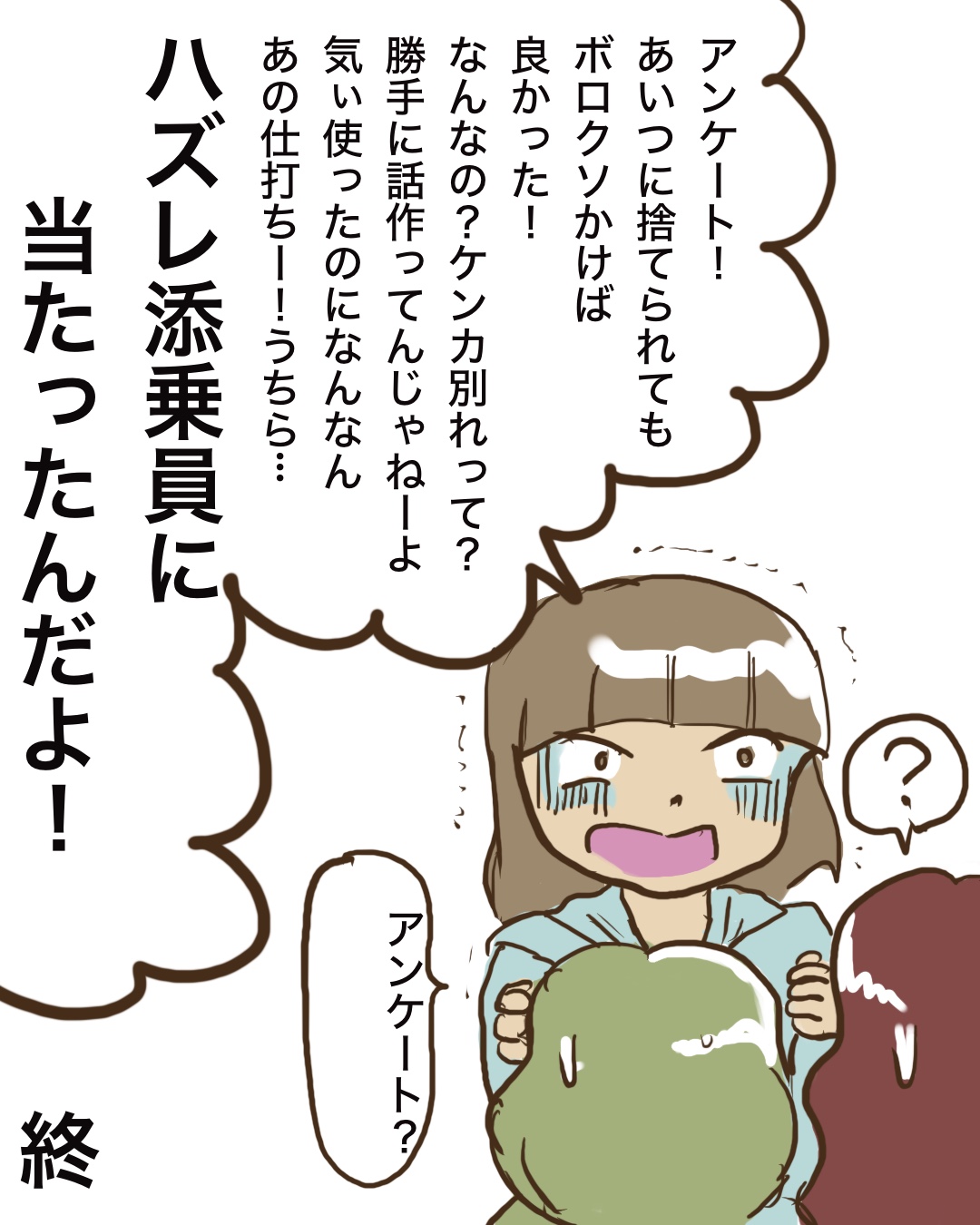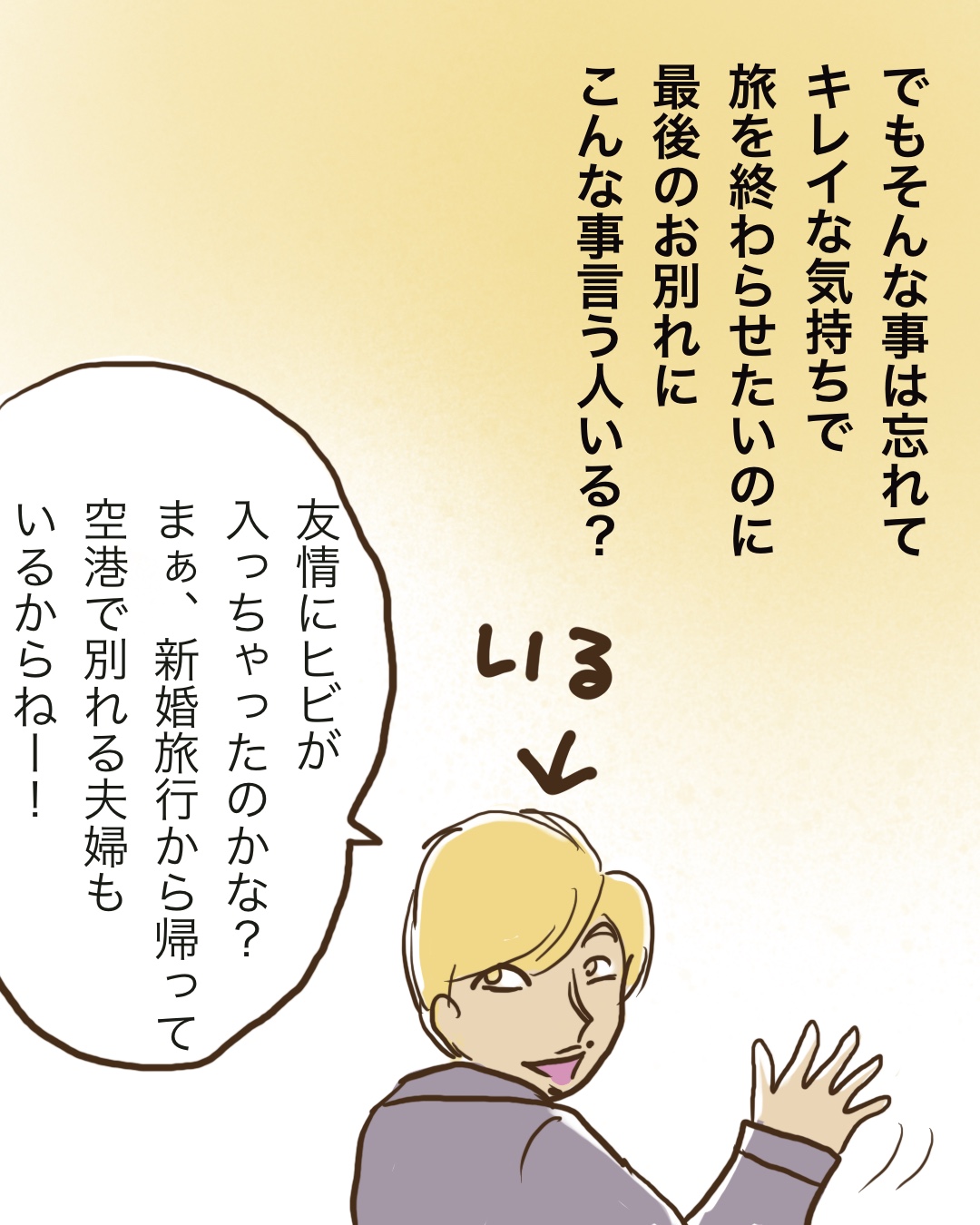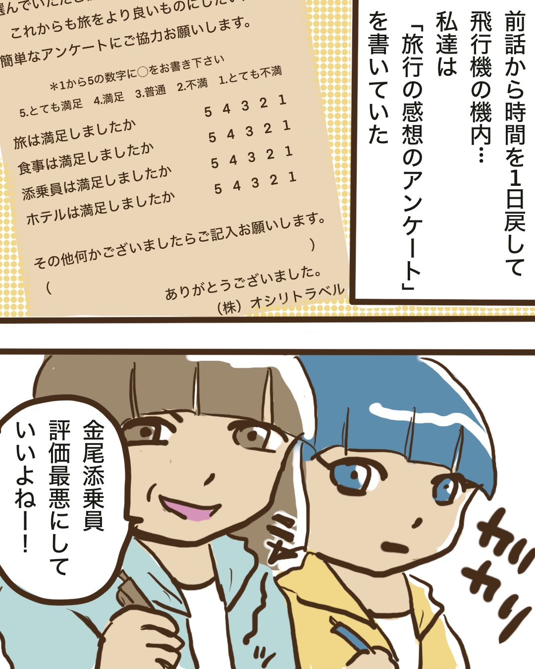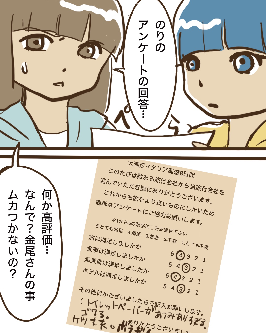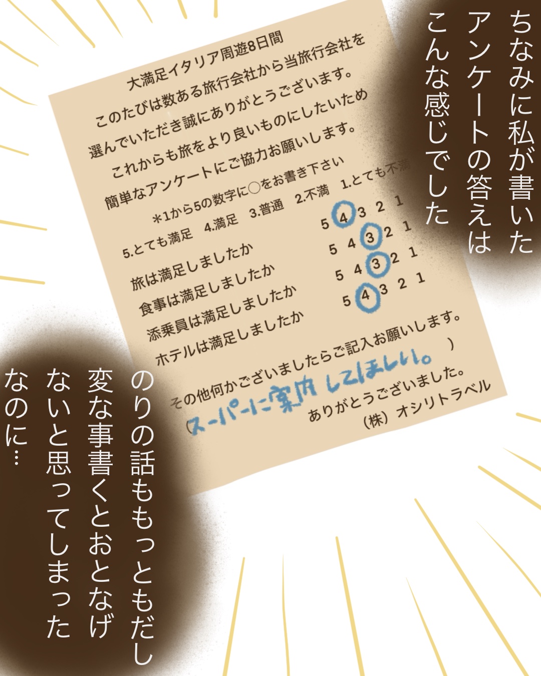 48話 イタリア旅行でハズレ添乗員に当選しました【最終話】 2025.12.08 イタリア旅行でハズレ添乗員に当選しました【完結済】 やばい添乗員, イタリア旅行, 旅行トラブル, 海外旅行 48話 イタリア旅行でハズレ添乗員に当選しました【最終話】 いよいよ最終話です。旅のアンケートを金尾添乗員に渡したのですが… 広告 広告 長かった旅漫画ですが、読んでいただき本当にありがとうございました。 ツアーってトラブルも少なくて安全なのですが..金尾添乗員はちょっと特殊でしたね..自分からネタを持ってくるというか… また違う旅漫画描きますので、次の旅も読んで下されば嬉しいです! 14 同じカテゴリの記事 48話 イタリア旅行でハズレ添乗員に当選しました【最終話】 47話 イタリア旅行でハズレ添乗員に当選しました 46話 イタリア旅行でハズレ添乗員に当選しました 45話 イタリア旅行でハズレ添乗員に当選しました 44話 イタリア旅行でハズレ添乗員に当選しました 43話 イタリア旅行でハズレ添乗員に当選しました 42話 イタリア旅行でハズレ添乗員に当選しました 41話 イタリア旅行でハズレ添乗員に当選しました 40話 イタリア旅行でハズレ添乗員に当選しました 39話 イタリア旅行でハズレ添乗員に当選しました 38話 イタリア旅行でハズレ添乗員に当選しました 37話 イタリア旅行でハズレ添乗員に当選しました 36話 イタリア旅行でハズレ添乗員に当選しました 35話 イタリア旅行でハズレ添乗員に当選しました 34話 イタリア旅行でハズレ添乗員に当選しました 33話 イタリア旅行でハズレ添乗員に当選しました 32話 イタリア旅行でハズレ添乗員に当選しました 31話 イタリア旅行でハズレ添乗員に当選しました 30話 イタリア旅行でハズレ添乗員に当選しました 29話 イタリア旅行でハズレ添乗員に当選しました 28話 イタリア旅行でハズレ添乗員に当選しました 27話 イタリア旅行でハズレ添乗員に当選しました 26話 イタリア旅行でハズレ添乗員に当選しました 25話 イタリア旅行でハズレ添乗員に当選しました 24話 イタリア旅行でハズレ添乗員に当選しました 23話 イタリア旅行でハズレ添乗員に当選しました 22話 イタリア旅行でハズレ添乗員に当選しました 21話 イタリア旅行でハズレ添乗員に当選しました 20話 イタリア旅行でハズレ添乗員に当選しました 19話 イタリア旅行でハズレ添乗員に当選しました 18話 イタリア旅行でハズレ添乗員に当選しました 17話 イタリア旅行でハズレ添乗員に当選しました 16話 イタリア旅行でハズレ添乗員に当選しました 15話 イタリア旅行でハズレ添乗員に当選しました 14話 イタリア旅行でハズレ添乗員に当選しました 13話 イタリア旅行でハズレ添乗員に当選しました 12話 イタリア旅行でハズレ添乗員に当選しました 11話 イタリア旅行でハズレ添乗員に当選しました 10話 イタリア旅行でハズレ添乗員に当選しました 9話 イタリア旅行でハズレ添乗員に当選しました 8話 イタリア旅行でハズレ添乗員に当選しました 7話 イタリア旅行でハズレ添乗員に当選しました 6話 イタリア旅行でハズレ添乗員に当選しました 5話 イタリア旅行でハズレ添乗員に当選しました 4話 イタリア旅行でハズレ添乗員に当選しました 3話 イタリア旅行でハズレ添乗員に当選しました 2話 イタリア旅行でハズレ添乗員に当選しました 1話 イタリア旅行でハズレ添乗員に当選しました 前の記事 47話 痴漢なんて捕まえるもんじゃない そう思った。 2025.12.05 次の記事 韓国旅行レポ(2011年)① 2025.12.11 アプリなら通知ですぐ読める! NAPBIZブログ
