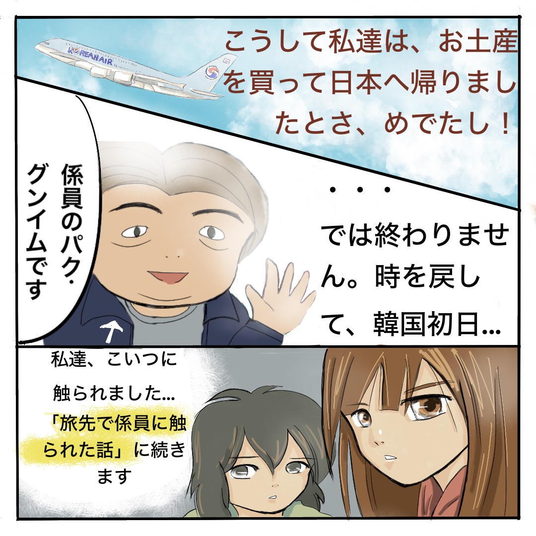 今回の漫画じつは初日の韓国係員の方に,車中で触られています。