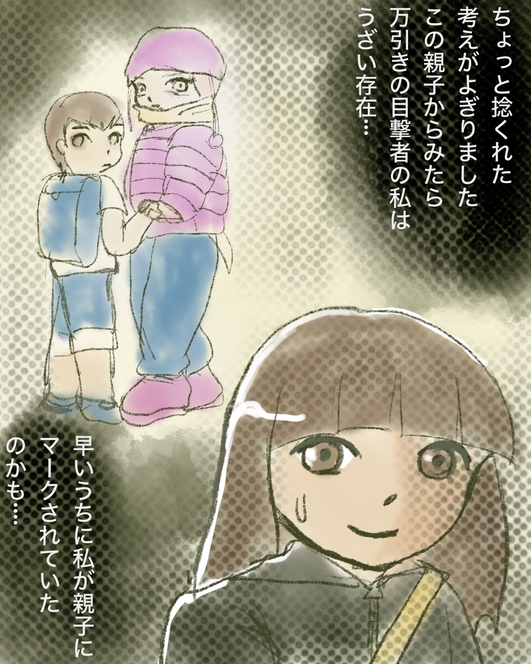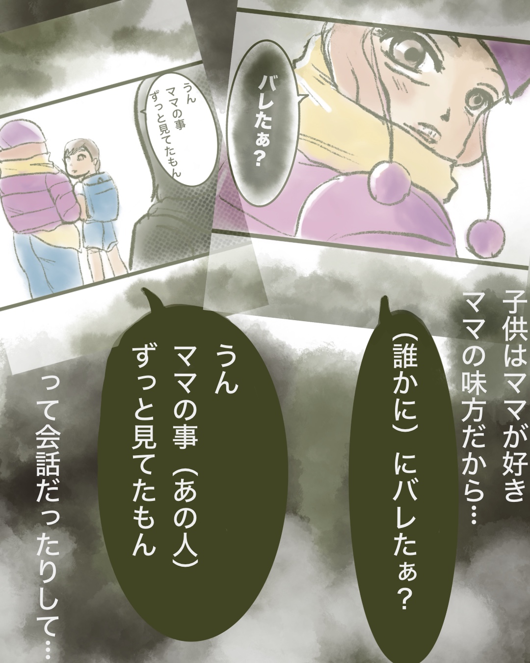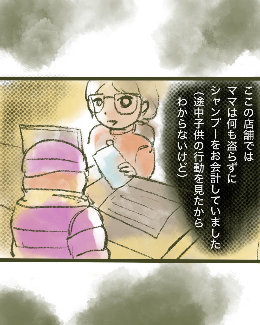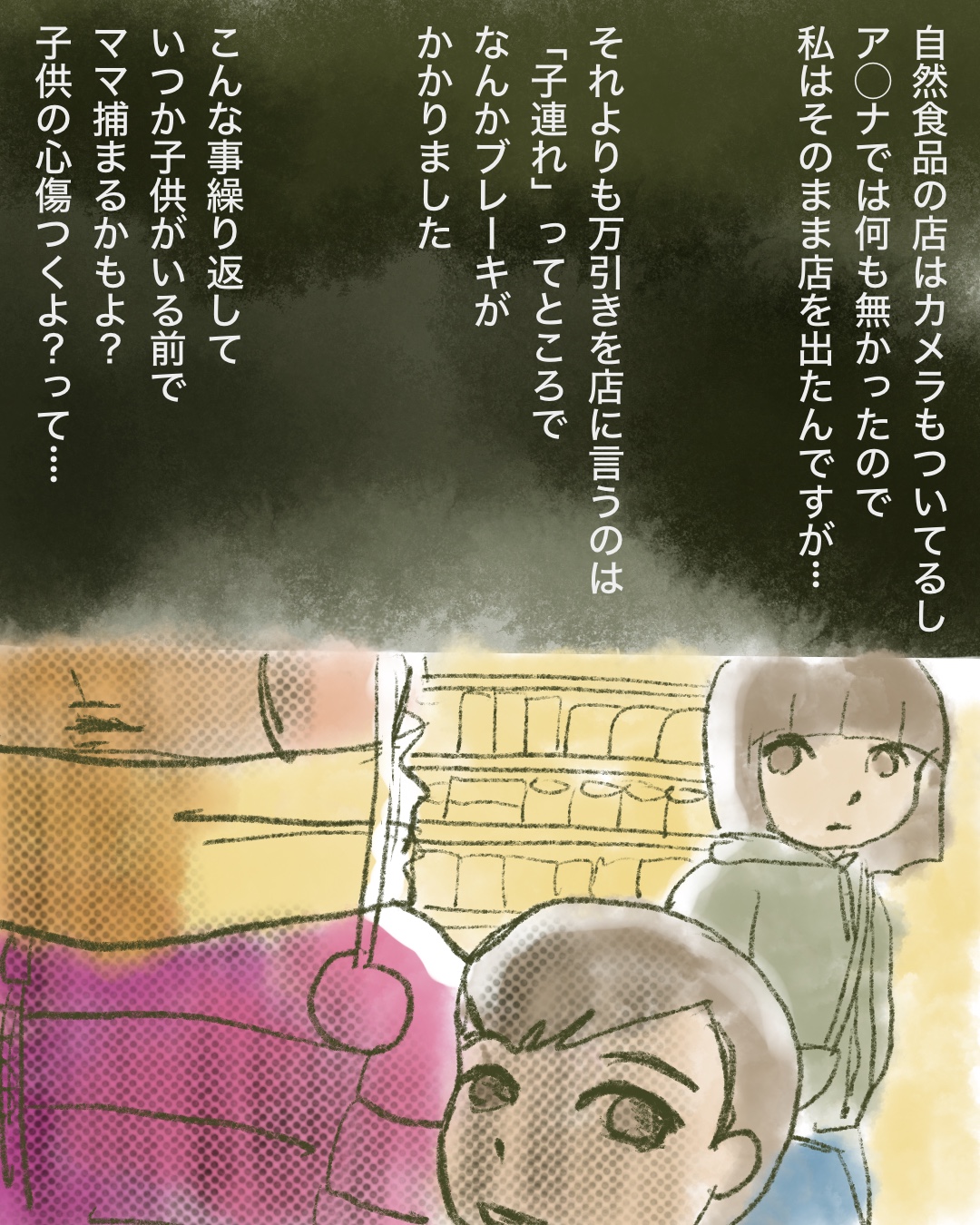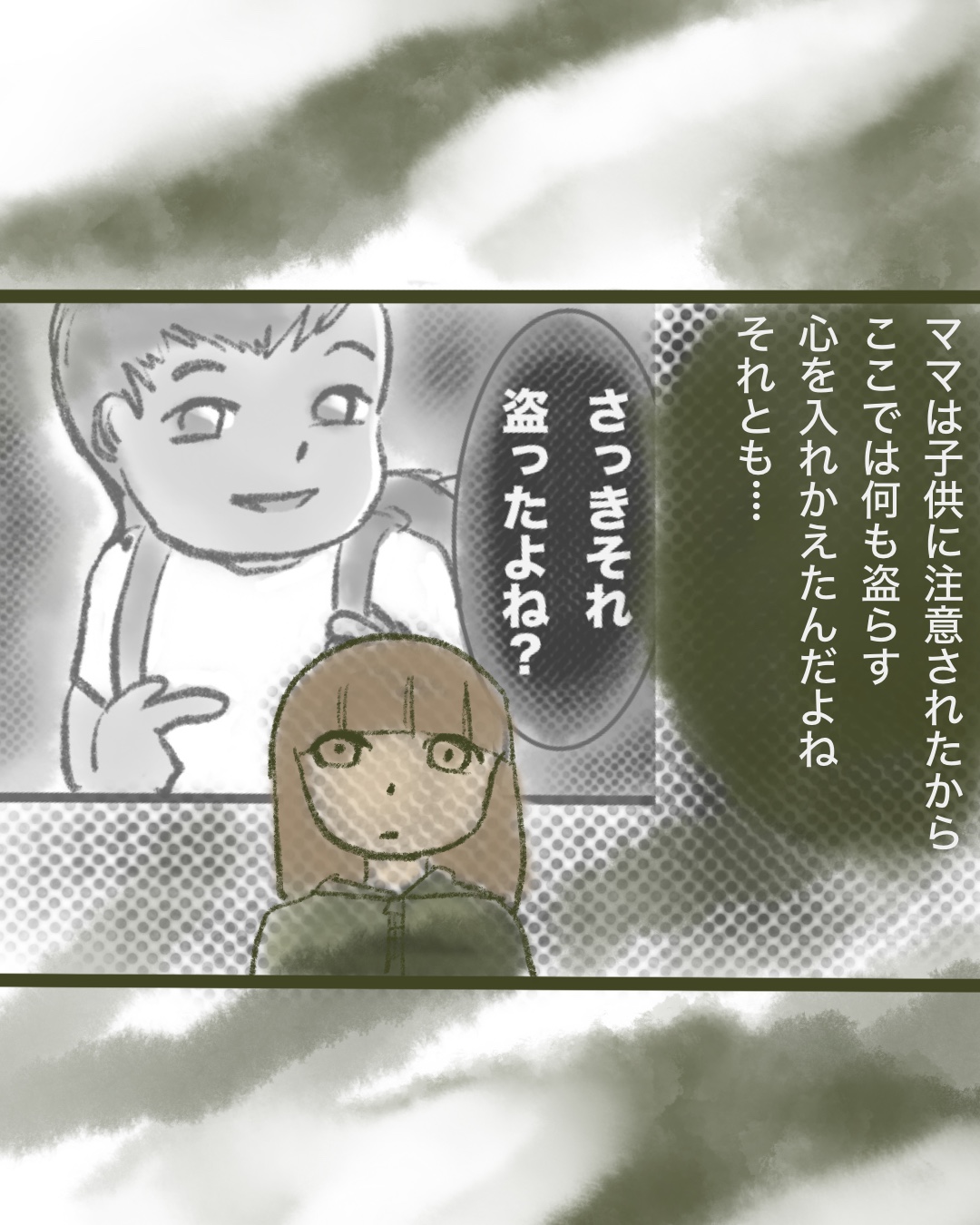 この漫画を描き始めた時は、「子供はママを注意したんだな、ママ,反省するといいな…」と思っていましたが…子供って万引きしようがママの味方だよな…と思い始め、描き始めと全然違う終わり方になりました。