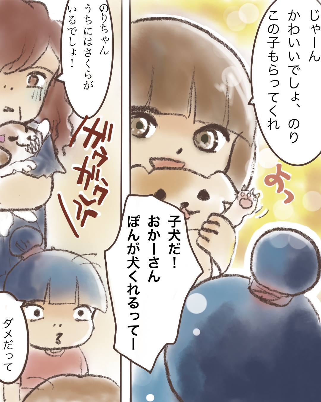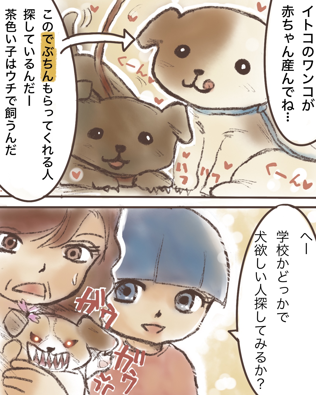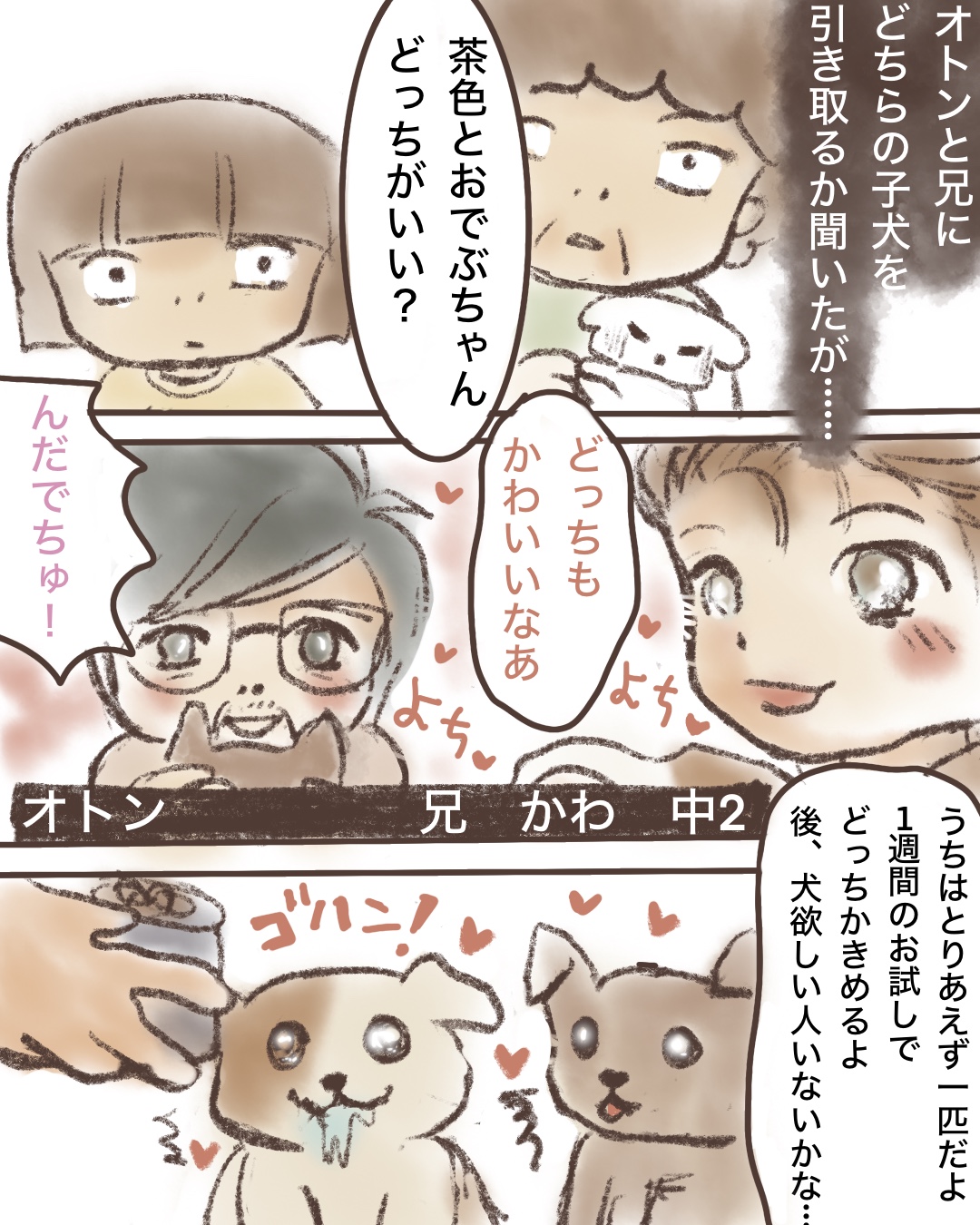 いとこの犬が子犬を産んだ。お母さんのお気に入りの「でぶちん」と私のお気に入りの「茶色い子」を家に連れてきた。うちではすでにマルチーズがいたため、どちらかの子を選ばなければ…